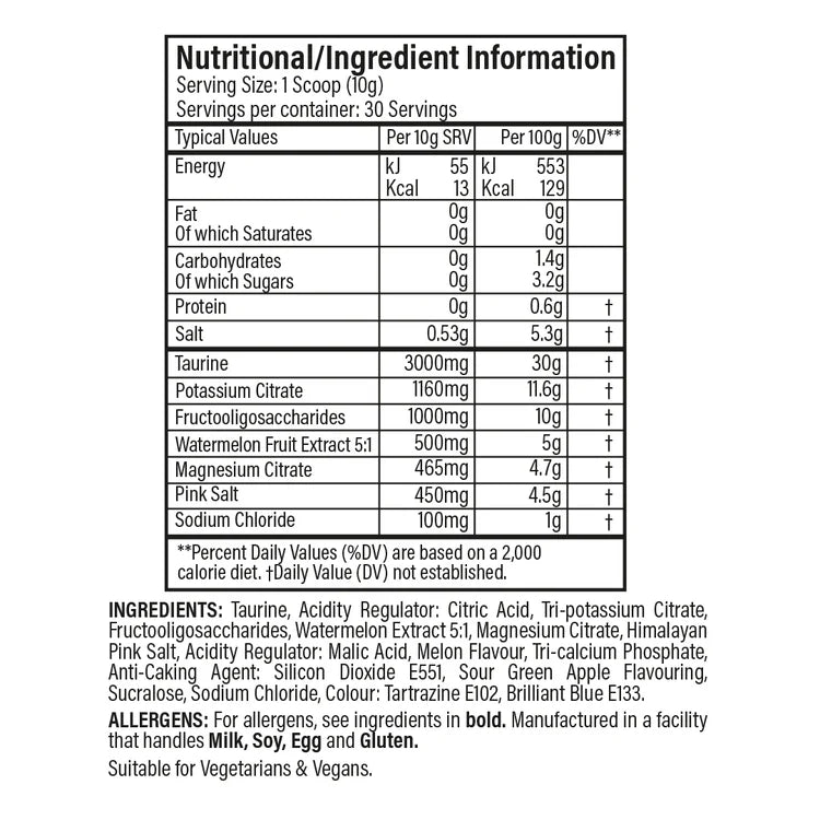(Based on Melon & Apple flavour) Taurine, Acidity Regulator; Citric Acid, Tri-potassium Citrate, Fructooligosaccharides, Watermelon Extract 5:1, Magnesium Citrate, Himalayan Pink Salt, Acidity Regulator: Malic Acid, Melon Flavour, Tri-calcium Phosphate, Anti-Caking Agent; Silicon Dioxide E551, Sour Green Apple Flavouring, Sucralose, Sodium Chloride, Colour; Tartrazine E102, Brilliant Blue E133.