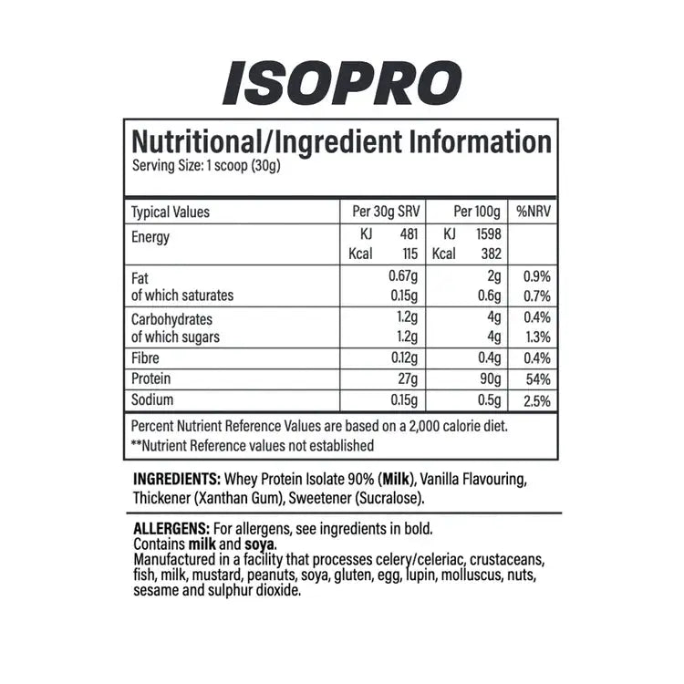 Whey Protein Isolate (Milk), Cocoa Powder, Flavouring, Xanthan Gum, Salt, Astragalus membranaceus and Panax notoginseng extract (as AstraGin), Sweetener (Sucralose), Emulsifier (Soy Lecithin)
