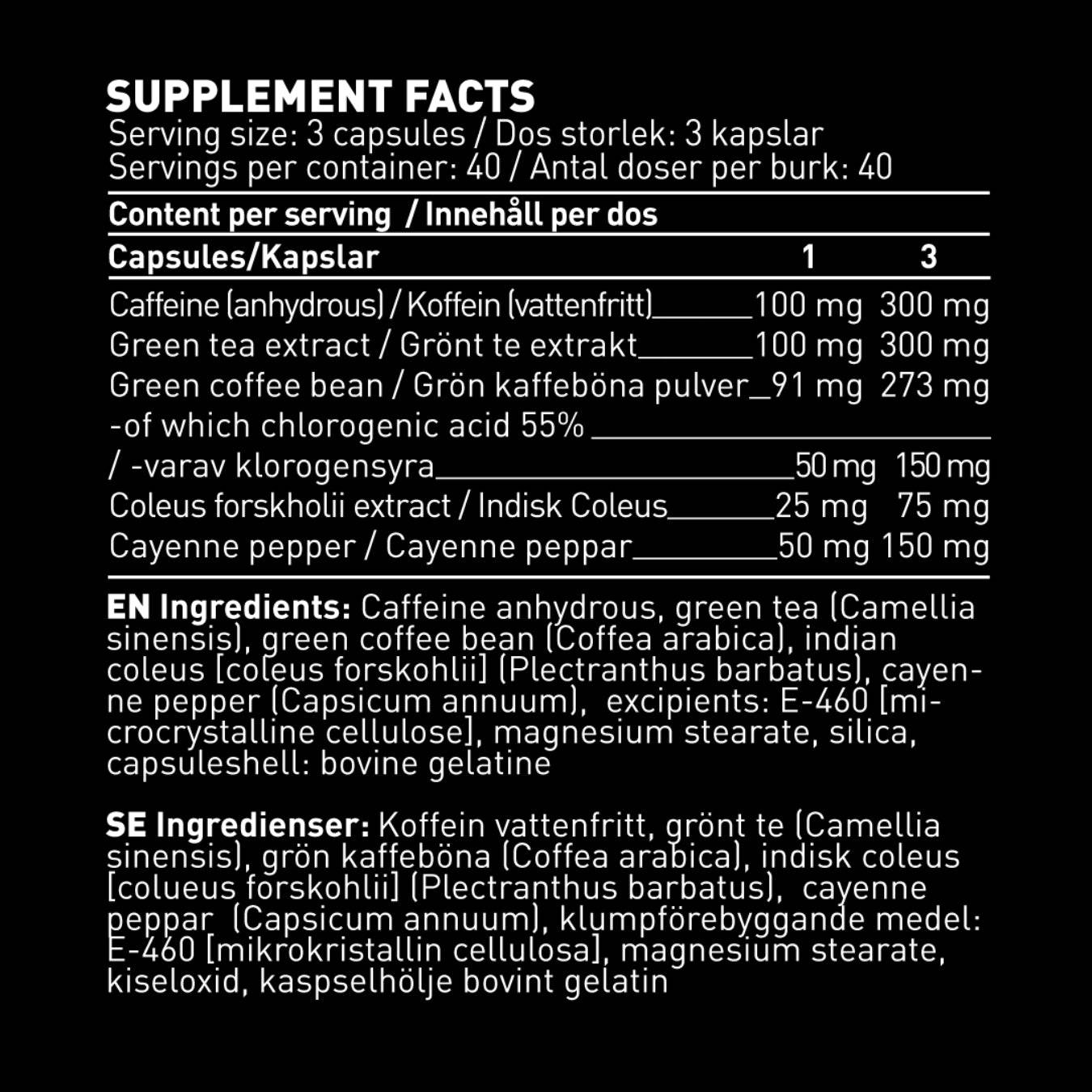 Cutter has been developed by Swedish Supplements product development team and includes a combination of caffeine, catechins, Forskolin and Chlorogenic acid from Green Coffee Beans. A recipe that works synergic to help you reach your goal: fast and effective weight loss!