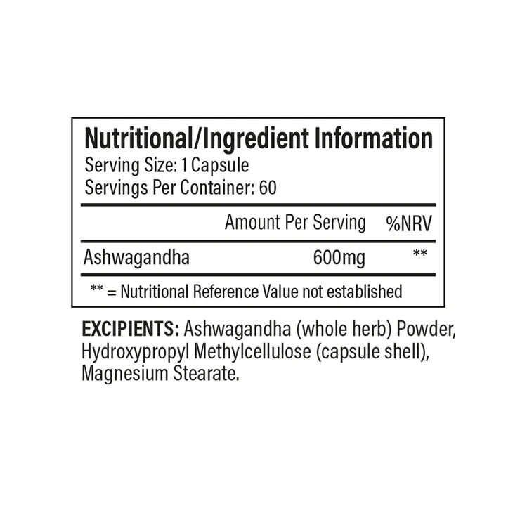 Ashwagandha (whole herb) Powder (600mg KSM-66 Ashwagandha per capsule), Hydroxypropyl Methylcellulose (capsule shell), Magnesium Stearate