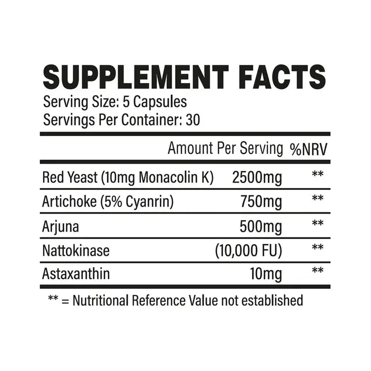Red yeast (10mg Monacolin K), Artichoke (5% Cyanrin), Arjuna, Nattokinase, Astaxanthin, Silicon Dioxide, Hydroxy Propyl Methyl Cellulose (HPMC Capsule), Maltodextrin, Magnesium Stearate
